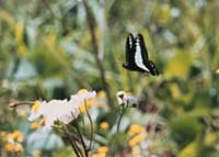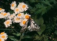 | 最後に、少し変わった白いアゲハチョウの仲間、ウスバシロチョウの話をしましょう。日本には、3種類のウスバシロチョウの仲間が住んでいます。その内、ヒメウスバシロチョウとウスバキチョウは北海道だけに棲んでいます。もう1種類のウスバシロチョウは本州と四国と北海道に棲んでいます。