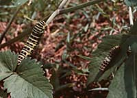 | キアゲハは、アゲハと同じ時期に姿を現しますが、1年間で2回から4回位しか発生しません。主に、セリ科の植物のニンジンやミツバ、セリ、パセリ等の畑で栽培されている植物を食べて育つため、畑の近くや明るい草原等でよく見かけます。キアゲハは、アゲハとよく似ていますが、前バネの基部(付け根)の所が全体に黒いので区別できます。幼虫は、4齢までアゲハと同じように鳥の糞に似た黒と白の模様をしていますが、オレンジ色の斑点があり目立ちます。終齢になると緑色と黒色の縞模様で黒色の縞にオレンジ色の斑点がある、綺麗な芋虫に変身します。 |