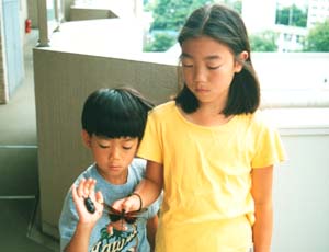 ヒラタクワガタとカラスヤンマを持つ子供達
