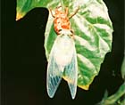 | 朝5時5分におきてみたら、よう虫のからの横に、とまっていました。 羽のすじは、こい茶色になっていました。 体のもようも出てるけど、全体に金色の毛がついていてとってもきれいです。ミンミンゼミはメスでした。 |