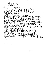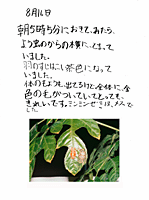 さいしょに、おしりでつかまっているので、とっても、おちそうでしんぱいでした。 公園にお父さんと弟とわたしの3人でセミのよう虫をさがしにいったときに、せなかがわれてしんでいるのをみつけたので、このセミは大じょうぶかと心配でした。でも、ちゃんと羽化してとんでいってくれたので、うれしかったです。 今は、そのセミはどこにいるのかなぁ? 羽がのびはじめて、のびおわるまで、とってもスピードが早くて、すごいと思いました。 |