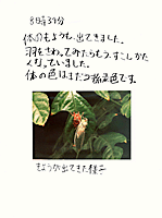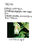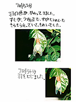 | 羽の色がかわってきました。 すじがうす緑で、中がとうめいで、きらきら光っていて、きれいでした。 |