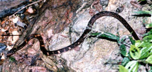 河原に降りてみるとアカマタの幼蛇とガラスヒバアが今年上陸した小さなカエル達を狙っていました。ヤンバルの守り神、ハブも鎮座していました。捕虫網でツンツンとつついてからかった後で、カメラを持って近づいて行ったのですが、一瞬目を離した隙に視界から姿を消してしまいました。こりゃやばい!その場を早々に退散して今夜の観察は終わりにしました。 |