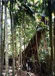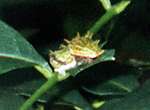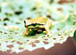 滝に到着して一休みの後、渓流沿いの湿ったトレイルを進みます。葉っぱの上で休んでいる可愛いカエルを見つけました。アマガエル科のカエルのようですが名前が解りません。 |
