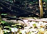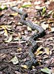 時間が随分過ぎてきました。そろそろ引き返そうかと思っていたところ、オーストラリア人の男性二人組が、この先で2.0m強のヘビを見て怖くて引っ返してきたという情報をくれました。ヒガシアオジタトカゲの居場所を教えてあげたので、そのお礼だったのかもしれません。見つけられる可能性は低いと思ったのですが、とりあえず行ってみることにしました。10分位歩いたでしょうか。やっぱりダメかと思い始めた時でした。いましたいました。2.5mは楽に超える巨大なカーペットニシキヘビです。カメラを構えて近づいていきますがピクリともしません。あまりの巨大さに、ビデオを回している妻は「もういい」と言いながら後ずさりしてます。子供達は僕の後に付いてきます。あまりに動かないため写真撮影を終えた後、棒ツンツンしてやりました。そして、動いてる姿をビデオに収めて昼の部の散策を終了しました。 |