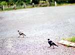帰り道は蝶々の幼虫や倒木をひっくり返して昆虫等の小動物を探しながら戻りましたが、目的の昆虫は見付けられず、代わりに真っ黒で大きなタマヤスデをいくつかとアゲハチョウ科の幼虫を見つけました。ナショナルパークの入り口に戻ると、カササギフエガラスのペアが仲良く歩いていました。 |