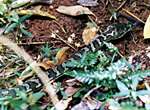 次に見つけたのは巨大なスキンク科のトカゲのヒガシアオジタトカゲです。ペアで日光浴に出てきた個体のようです。真っ黒く光沢があり、60cm程度の大きさがあります。4m位まで近づくとシューという音を出して威嚇してきます。実は別の場所で娘が見つけたのですが、その時は撮影する前に逃げられてしまったトカゲだったのです。だから、どうしてももう一度見つけたかったのです。このトカゲを妻は“ウナギイヌ”と呼んでいます。 |