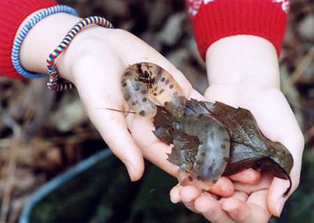 落ち葉に生み付けられた卵嚢(1対)