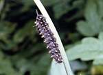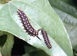 孵化した幼虫は、ウマノスズクサを食べながら成長し、2〜3齢まで食草の葉裏で群生します。4齢位まで成長すると、ウマノスズクサはほぼ食べ尽くされた状態になり、幼虫は食草を求めて分散していきます。5齢(終齢)になると、単独で食草の茎や葉裏にとまっているところをよく見かけます。 |