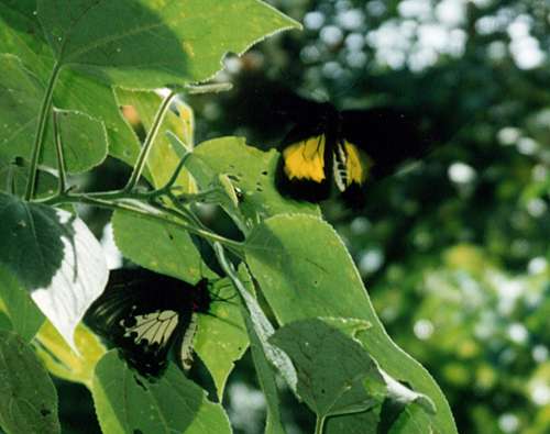 パプアキシタアゲハ♀(左下)と求愛行動中の♂