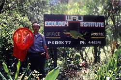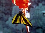 皆さんは、昆虫採集ネットの色というと何色を想像しますか。多くの人は白色と答えるのではないでしょうか。答えはブッブー。実は熱帯地域で蝶類を採集する場合は、赤色のネットが有効なのです。理由はよく解りませんが、多分、熱帯林は以外と花が少ないため、赤い花を好むアゲハチョウの仲間は、赤色のネットを花だと思って近寄って来るのだと思います。 |