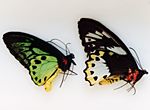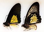 キシタアゲハは、トリバネアゲハに次ぐ人気のある仲間で、東南アジアを中心に分布しています。このグループは一様に雄の前翅がビロード状の黒色、後翅は黒色を基色に金属光沢のある黄色で彩られています。雌はトリバネアゲハと同様に地味です。 |