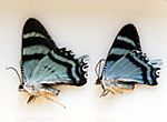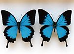 オオルリアゲハは、ニューギニア島を中心に分布しています。青色に輝く綺麗なアゲハチョウの仲間で、日本に分布するカラスアゲハやミヤマカラスアゲハに比較的近い仲間です。この蝶は赤ネットにも集まりますが、林縁で蝶道をつくって飛翔している時は、青色に光る物をちらつかせると敏感に反応するようです。それは、なわばりをつくって蝶道を飛んでいる雄は、青色に光る物を同種の蝶だと思い、攻撃をするために近寄ってくるのだと思います。南アメリカに分布するモルフォチョウも同じような方法で採集することがあります。 |