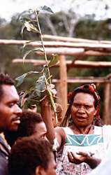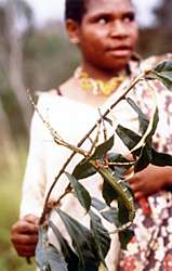 今回の採集旅行では、メガネトリバネアゲハ、ゴライアストリバネアゲハ、パプアキシタアゲハの3種を見ることができました。また、集落周辺の谷部に残る林では、この蝶達の食草であるウマノスズクサが自生しており、多くの蛹や幼虫も見付けることができました。 |