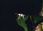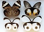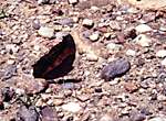 原生林を抱えた渓流には、シジミチョウの仲間やシロチョウやタテハチョウの仲間が沢山吸水に集まってきます。採っても採ってもきりがありません。三角ケースに入れた三角紙があっと言う間に一杯になってしまいます。予備の三角紙を詰め直し、場所を変えて採集しますが、さすがに目新しいものが出てこないとネットを振る気にならなくなります。そこで渓流を遡って薄暗い林内に分け入ることにしました。しばらくすると足下からフワフワーっと中型の蝶々が飛び立ちました。あわててネットを振り採集してみるとメダマチョウの仲間です。メダマチョウはニューギニア島を中心として生息している蝶で日本のジャノメチョウの仲間に近いグループです。メダマチョウの特徴は、名前の通り大きな目玉模様(眼状紋)を持つことで、この目玉模様が天敵である鳥をビックリさせて攻撃から身を守るのに役立っていると言われています。田畑で目玉模様の鳥除けを付けるのもこの効果を利用した物です。 |