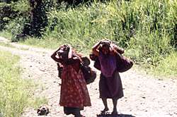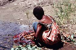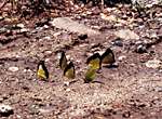 昼間近くになると、周辺の村の女性が河原に野菜を洗いに来たりします。炊事の邪魔をしないように吸水に来た蝶や昼蛾の採集を続けます。 |