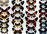 そうこうするうちに次は、採集の対象を蝶から昼蛾に変えて楽しむことにしてみました。蛾と言うと夜間に電灯に集まる地味な昆虫のイメージが強いと思いますが、熱帯地域には綺麗な金属光沢を持ち、昼間に活動する蛾が沢山生息していて、私もその綺麗さから密かにコレクションしています。その昼蛾が渓流沿いや林縁に飛んでいます。採集してみると同じ種だと思っていた昼蛾が少しずつ違っています。3〜4種程度は混ざっているようです。大型で綺麗なオジロツバメガも吸水にやってきました。ニューギニアには、このツバメガをモデルとし、そっくりに擬態する珍種のラグライズアゲハ(ニセツバメアゲハ)というアゲハチョウがいるので、これと思うものを沢山採集してみましたが、残念ながら1匹も混ざっていませんでした。 |
