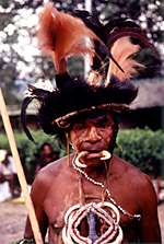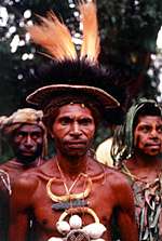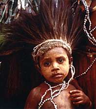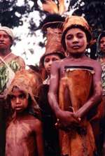 シンシンを披露してくれた原住民達(頭はゴクラクチョウやヒクイドリの羽根、首はタカラガイやノブタの牙で飾り、腰や子供の頭は木の皮を鞣した布タパを巻いている) |
