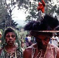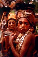 そんなある日、住人達が民族衣装に身を固めてシンシン(舞踊)を見せてくれました。頭はゴクラクチョウやヒクイドリの羽根で飾り、首からはタカラガイと野豚の牙で装ったネックレスやクスクスの毛で編んだ袋をかけています。腰にはタパと言う木の皮を鞣した布をふんどしのように付けています。原住民の人達は、自然と共生し、自然の恵みを巧みに利用することで、独自の文化を育んでいるのです。 |