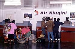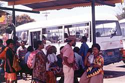 飛行機は香港を経由して翌24日の朝にパプアニューギニアの首都、ポートモレスビーに到着しました。そこから国内線に乗り換えてラエという都市に行くのですが、国内線の待合室は我先にと航空券を求める人でごった返していました。日本では考えられないことですが、大きなナイフや斧を持った原住民達も平気で国内線に乗り込みます。ぶっそうな刃物を自慢げに持った原住民達と我々を乗せた飛行機は、無事にポートモレスビーを飛び立ち、急旋回を繰り返した後ラエに到着しました。 |