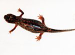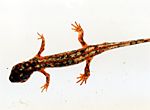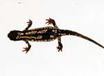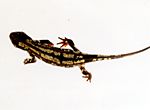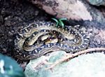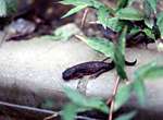 さて、話しを戻すと、半分やけになって石をどんどんはぐっていきます。でもやっぱりいません。おまけに、石はぐりに夢中になっていたため、とぐろを巻いているハブに1m位の距離で接近遭遇。機嫌を損ねて噛み付かれなくてほっと一息です。カメラを構えて何枚かの写真を撮った時点で妻を呼び寄せました。妻曰く「他のヘビと全然違うのね〜大きいし筋肉質だし・・・でもきれい・・・絣の模様みたい」。絣模様を想像するあたりが何とも鋭い。 |