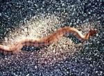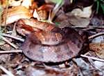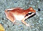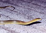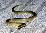 車に驚いて毎度お馴染みのハナサキガエルやニホンカジカガエルが飛び跳ねます。少ないながらリュウキュウアカガエルも見付けました。それらのカエルを狙ってヒメハブが林道に出てきていました。「久米島生きもの紀行」で紹介したリュウキュウアオヘビも見付けました。大変綺麗な個体ですが気が荒くすぐに噛みつこうとしてきます。 |