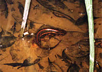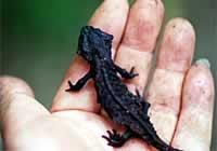 それ以降も、めぼしい石があると車を停めてはぐっていきますが、イボイモリは出てきません。そうこうしているうちに湧水のある水汲み場がありました。周辺は土の湿り具合といい、これこそはといった環境です。気合いを入れて次々と石や倒木をはぐっていきます。いました、いました。イボイモリです。でもこの個体は病気らしく、痩せ細り、片目が潰れていました。涙を飲んでリリース。沖縄では1箇所で見付かるとその周辺で複数が見付かることが多いのですが、ここでは次が見付かりません。やはり奄美大島は生息密度が低いのかもしれません。 |