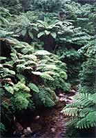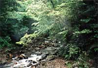 しょうがないのでこの場所をあきらめて、今日の調査のメーンイベント、昨日見付けておいた渓流岸の調査箇所に移動します。悪路を移動すること30分。ふと見たガソリンメーターが危険ゾーンを指してるではないですか。カビーン・・・こんな所でガス欠になったらどうしようもありません。一応、携帯電話もチェックしてみましたが「こんな所で通じるわけないでっしゃろ」とあっさりした返事。 |