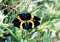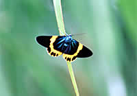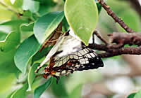 次に住用村のマングローブ林や大島紬の工場を見学し、物産センターで買い物でも・・・と思い車を停めました。ところが駐車場の生け垣に、綺麗な昼蛾のキオビエダシャクが飛び交っているではないですか。早速、ネットを出して採集です。密かに昼蛾のコレクションをしているため、久々に熱くなっての採集です。妻がイシガケチョウの羽化シーンも見付けてくれました。思いがけない収穫に時間を費やしましたがフライトの時間が近づいてきたので、空港に向けて車を走らせます。急ぎながらも、途中で奄美のおすすめ"鶏飯(けいはん)"という、ぶっかけご飯(実にうまい!!)はしっかり食べて奄美大島を後にしました。 |