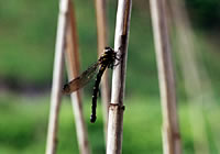 ヨシが生い茂る湿地を移動中に偶然、枯れたヨシの茎にとまっているムカシトンボも見付けました。 |