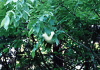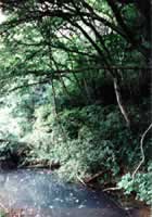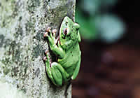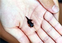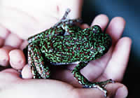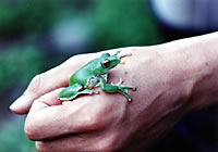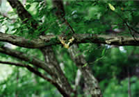 予定地での調査を終えて帰り支度をしていると、Nさんがモリアオガエルを捕まえてきました。そのカエルの写真撮影をしていると今度はMさんがモリアオガエルが沢山鳴いていると耳を澄ましています。鳴いている場所はNさんがカスミサンショウウオの成体を見付けた場所の近くのようです。 |