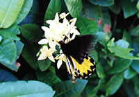 | 渓流沿いの柑橘系の果樹園周辺ではアオネアゲハやナガサキアゲハが飛んでいます。薄暗い林内ではイナズマチョウやルリモンジャノメの仲間も見付けました。林内の開けた場所では、ハレギチョウやヘレナキシタアゲハが吸蜜に訪れます。これらを次々と採集し、初日から充実した採集を楽しむことができました。 |
