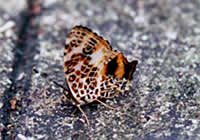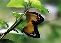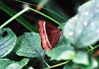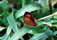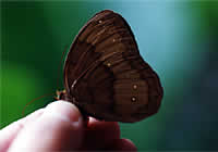 | 林縁部ではヒプセリスキミスジやコモンマダラの仲間等が見られ、原生林に囲まれた祭事用の小屋の周辺には、ホソチョウやイウデットマルバネシロチョウ、ウラフチベニシジミの仲間やヒメジャノメの仲間が飛び交っています。 |