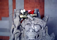 | 最後の1種、ベリサマを求めてポイントを移動することにしました。低地や山地で見つからなかったため、中間地帯を狙ってみることにします。 ブヤン湖から少し標高を下げたライステラスが美しい場所で写真撮影をしながら採集を試みます。オライアによく似ていますがコントラストの弱いカザリシロチョウが時々飛んできます。ベリサマカザリシロチョウに間違い有りません。久しぶりに全速力で走って1頭目をゲットし、その後、数頭追加しました。また、触角が1本折れていたため採集はしませんでしたが、巨大なシロスジカミキリ(バトケラの仲間)が石像に供えた花に来ているのを偶然見つけ、写真撮影することもできました。 結局、初めてのバリ島で5種類、全てのカザリシロチョウを採集することが出来ました。 |