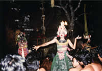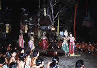 夕食の準備をしている煙が低く立ちこめ、日没を迎えると、バリの夜は穏やかに闇に包まれていきます。 我が家のバリ島での夜は、芸能を楽しんだり、ビーチを散歩したりして過ごすのが一般的です。 バリ島ではレゴン、バロン、ケチャ等の舞踊やガムランやジュゴク等の音楽演奏が毎日の様に繰り広げられ、その芸術性の高さに圧倒されるものがあります。曜日や場所、月齢等によって変わる演目を確かめて、それらを鑑賞するのは、バリ島の夜の醍醐味といってもいいと思います。 |