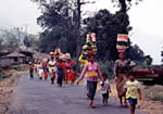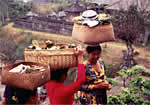 | バリ島の一日は朝のお祈りに始まり、夕のお祈りで終わります。 バリの家々にはサンガと呼ばれる祠があります。、女性や子供達が正装をして、日常的に朝夕2回、祠にお供えをし祈りを捧げます。お供え物は、椰子の葉で作ったお皿(コペル)に花や米粒を入れたものが一般的です(右写真)。 |