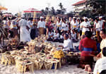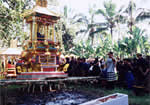 | 先祖を祀る儀礼には、死者の霊を浄化し、祖霊にするまでの儀礼があります。 通常は遺体を墓地に土葬し、それを数年後に掘り起こしてガベンと呼ばれる火葬式を行います。火葬は夕方に墓地で行われ、遺骨や遺灰は、椰子の実の殻に入れて海や川に流し清められ、神々と共に家族の寺院で祀られるようになります。 |