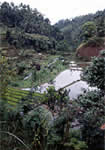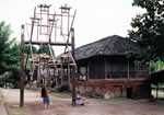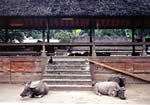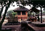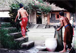 | トゥガナン村に着くと、寄付金を払い記帳をして集落内に入ります。集落形態は、長方形の外周の中央部に集会場や水汲み場等の公共施設があり、それを囲むように家屋が連なっているため、家屋の壁が集落の外壁の役目をし、要塞集落を思わせます。集落内では、水牛やニワトリ、アヒル等の家畜が放し飼いにされています。また集落の外れには沐浴場があり、周りには自然林も残っています。 私がトゥガナン村を訪れる理由は、自然林に抱かれた昔ながらの集落の有り様や集落形態の面白さ、バリ・アカの生活様式に触れること等にあるのですが、もう一つ、大きな目的があります。それは、カンベン・グリンシンと呼ばれるダブル・イカット(縦横両方の糸を染めて織る布)です。 |