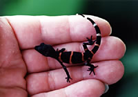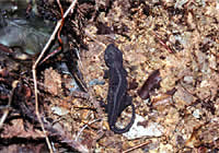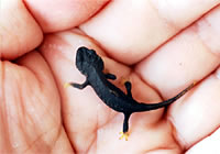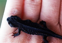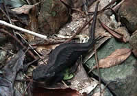 | そうこうしている内に、一昨年、昨年と多くのイボイモリを観察しているポイントに到着しました。でもやっぱりイボイモリは見つかりません。今年の春にこの場所を訪れた仲間が、1匹しか確認できなかったと言っていた事が思い出されます。もしかするとこのポイントは、大雨や長雨で長い間冠水してしてしまったのかもしれません。 仕方なく、ここで折り返して対岸の少し標高の高い所を調査しながら下って行くことにします。 下り初めてすぐのことです。 大きな石の下でやっとイボイモリを1匹見付けました。全長が14cmに達する立派な♂の成体です。さっそく2人を呼び寄せてお披露目です。 |