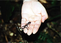 | 「これがイボイモリじゃー、凄いじゃろー、初めての沖縄でイボイモリが見られるなんて幸せ者なのだぞー、誰のおかげじゃー、感謝せー、ガッハッハー」てな具合に・・・・・(内心は見せてあげられてホッとしたのでした)。 1匹発見できると、衰えかけていたやる気が不思議と湧いてきます。みんなファイトもり・もり・・・・・で、もりちゃんが全長16cmの最大級の♀を含む2匹の成体を、しろちゃんが1匹の成体を、私が全長7cmの亜成体と5cmの幼体を追加し、計6匹を観察することができました。 |