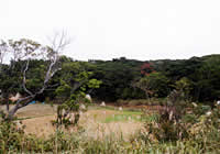 | 樹林地(二次林)に隣接している未舗装で凸凹の農道を車で進むと、農耕車によってできた水溜まりがあちこちに有るのが見えました。 | ![]() |