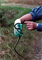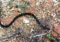 | 車から降りて水溜まりに近づくとヘビがいるのが見えます。ガラスヒバァです。きっとカエルを食べに出てきたのでしょう。捕まえて写真を撮ってリリースしてやりました。 |