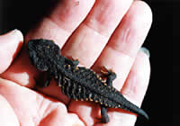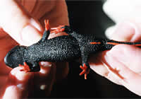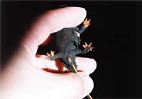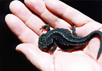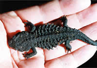 | 採集した20匹近い全ての個体は、性別、寸法を記録し、室内繁殖に必要な数だけ持ち帰り、残りはリリースすることにしました。 改めて採集した個体を眺めると沖縄本島北部産とは形態や大きさの違いが顕著です。 徳之島産の特徴をおおざっぱに言うと、沖縄北部産と比べて2周り以上小さく、頭でっかちで、肋骨の発達が著しいため平べったい印象を受けることです。体色は黒〜黒褐色で指先等の明褐色部が鮮やかに出現する傾向があります。 まあ、大きさ的には迫力に欠けますがイボイモリらしいイボイモリで、そのかっこよさはイボイモリ属No1です。 それにしても生態も形態も違うのにどうして誰も記載していないのか不思議でしかたありません。虫屋だったらさっさと記載してしまうのに・・・・・。小型のサンショウウオにしても名前が付いていない種が色々いるし・・・・・。 大先生達のくだらない派閥争い等に遠慮しないで、アマチュアや若手学者がさっさと記載すれば両生爬虫類の世界も、もっともっと活性化し、報文や研究論文も随分増えるのになーと思うのだけれど。何れにしても名無しのごんべいでは不便でしかたありません。 話が脱線しましたが、2日間の充実した調査成果の祝杯をあげるために、シャンパンを買い込みホテルに戻りました。 |