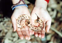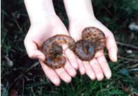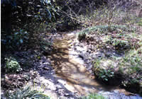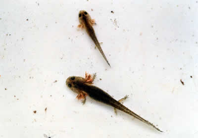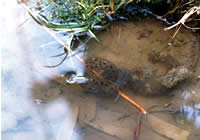 | トウキョウサンショウウオを確認できたのでほっと一息。次の場所に移動します。 次の場所は、登山道沿いの水路です。 いましたいました。この水路には沢山産んでいます。でもそのほとんどの場所の水が涸れそうになっていて、今にも卵嚢が干からびそうです。子供達が可哀想だから他の場所に移してやろうよーとせがみます。 仕方がありません。多くのハイカーに白い目で見られながら、干からびかけた卵嚢だけを安定した水場に移してやり、2対の卵嚢を持ち帰って飼育することにしました。 |