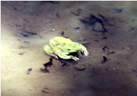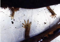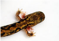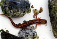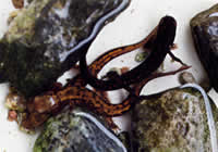 | 弁当を食べ終わり一段落してから、幼生が隠れていそうな石を一つ一つはぐっていきます。いました。ここぞと思う場所の石の下には必ず1匹以上の幼生が見つかります。あっと言う間に多数の幼生を採集することができました。その中から色々な模様のタイプを選んで今年上陸しそうな6匹だけ持ち帰ることにしました。それにしても模様が変化に富んでいて別種のように見えます。また幼生の顔をよーく見ると人面魚のような面構えです。 |