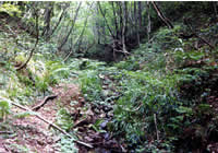 | ハコネサンショウウオの幼生が採集できたので、ブチサンショウウオとヒダサンショウウオを狙って、沢巾が狭く水量の少ない支流に入ってみることにしました。 この沢は、私が今までに経験したヒダサンショウウオの生息環境より流速は緩やかで、生息の可能性は低いのですがとりあえず石をはぐってみることにします。 |
