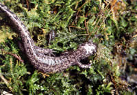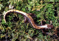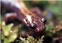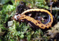 | ブチサンショウウオの成体も観察できたし、腰も相当痛くなってきたため、そろそろやめようかと思っていたときです。川岸の大きな石をはぐった瞬間、何かが素早く別の石の下に隠れたのが見えました。水中ではないためトカゲかと思ったのですが、念のためにその石をひっくり返してみると、そこから出てきたのはハコネサンショウウオの成体でした。こうなったら同じ様な川岸の石を徹底的にはぐっていきます。いました。2匹目の成体です。どちらも模様の綺麗な典型的な西日本タイプの個体です。幼生は無愛想な顔をしていますが、成体は目が飛び出ていて、可愛い顔をしています。 |