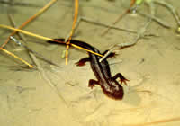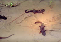 | 所々にある溜池や水溜まりの周辺で、イボイモリを捜しますが、見つかるのはアマミシリケンイモリやサソリモドキばかりです。 雨も本降り状態になってきたため、調査は取りやめて名瀬に向かい、食料を買い込んで宿泊地の北部のリゾートホテルに向かいました。 |