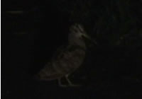 | 次に姿を現したのはアマミヤマシギです。真っ暗な林道で突然ライトに照らし出された姿は幻想的ですらあります。前回は撮影したフィルムを無くしてしまったため、是非紹介したい鳥のひとつでした。土砂降りの雨の中よく出てきてくれたものです。 さて、今夜の観察はこれでおしまいです。 ホテルに戻って、今日出会った生きもの達の話で盛り上がりながら、酒が進んだのは言うまでもありません。 |