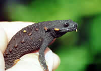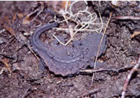 | 21日 実質的に今日一日が最後の調査日です。朝から気合いが入っています。 天候は曇り、でも朝食を済ませ9時30分にホテルを出発する頃には、ポツポツと大粒の雨が降り始めてしまいました。今日も一日雨模様です。 今日は名瀬側から中央林道に入り、イボイモリの生息の可能性がありそうな場所を徹底的に調べる予定です。10時過ぎから調査開始。車をこまめに止めて、片っ端から石や倒木をひっくり返して行きます。 毎度の事ながら私はユンボ・私はユンボ・私は工業機械・私は工業機械と呟きながら。しかし、1匹も見つけられないまま時間だけがいたずらに過ぎていきます。12時近くになった頃でしょうか。去年見つけた場所によく似た環境が現れました。否応なしに手鍬を持つ手にも力が入ります。周辺部から徹底的に落ち葉や倒木をはぐっていきます。時にははぐった下を掘り返しもします。知らない人が見たら、畑を耕しているように見えるだろうナーと思いながら・・・。 さて、周辺部から捜し始めて10分ぐらい過ぎた頃です。落ち葉をはぐった瞬間です。ジャン、ジャ、ジャーン。いました。奄美産のイボイモリの発見です。 大きくてりっぱな成体です。しかもアゴの当たりに赤斑が出ていて綺麗です。写真撮影しプラケにストックします。坊主にならなくてほっと一息です。 |